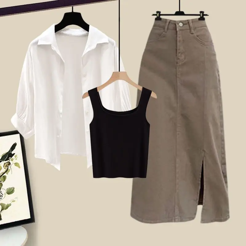 The inclusion of a denim skirt adds a touch of classic elegance to the set, allowing for versatile styling options.