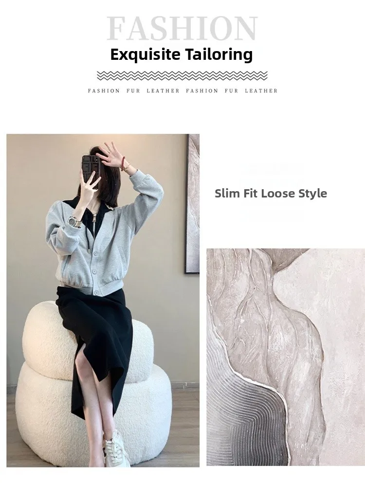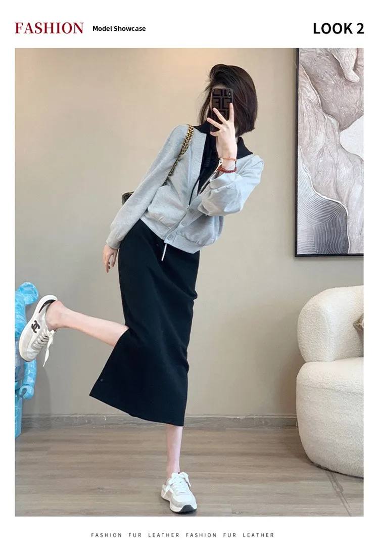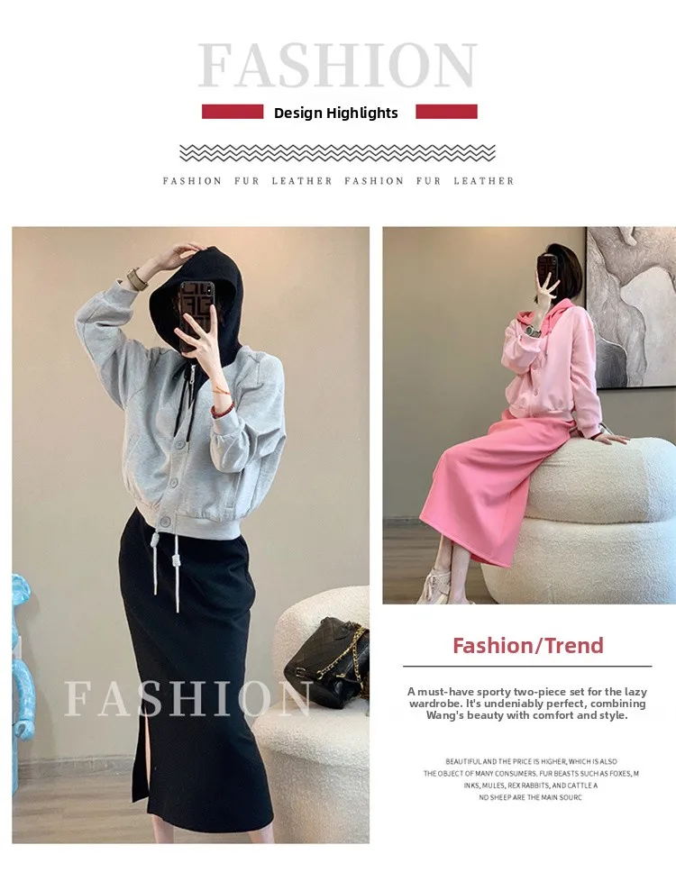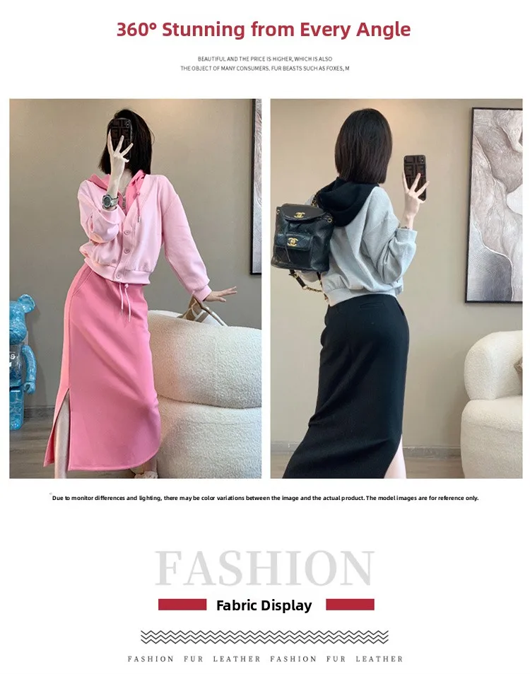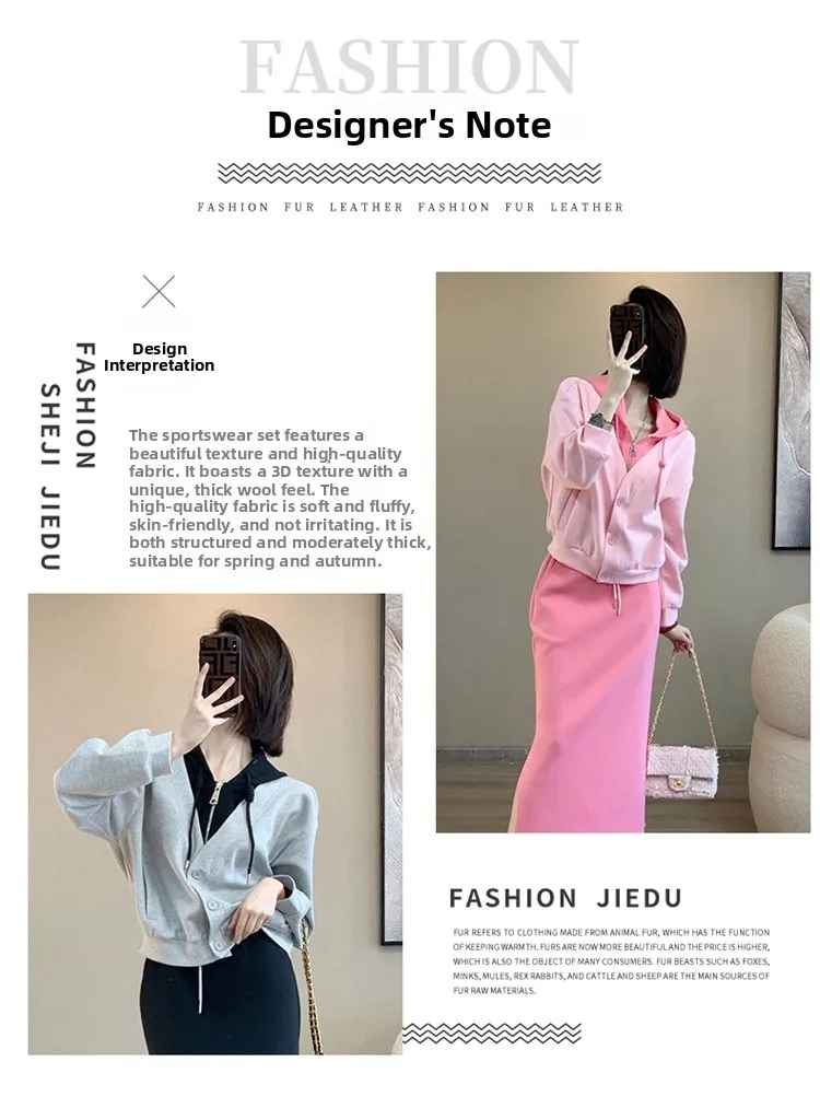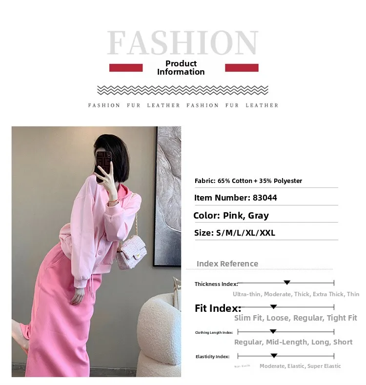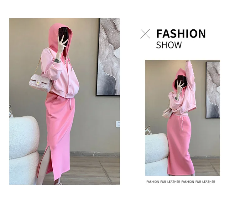 This 2025 early autumn fashion set includes a slimming pink sweatshirt and a high-waisted mini skirt, perfect for petite women seeking a stylish look.