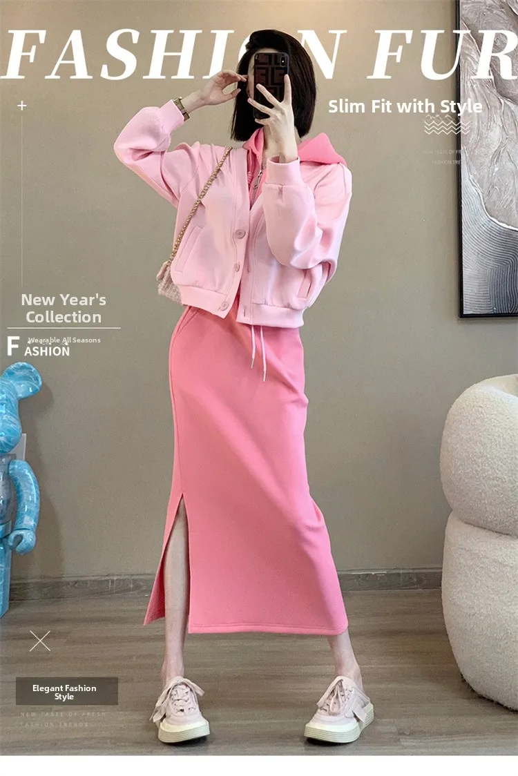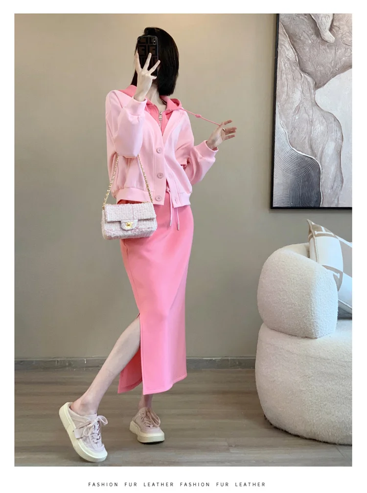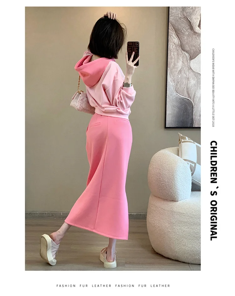 Early Autumn Fashion Set Pink Slim Fit Sweatshirt High Waist Skirt Stylish Two
