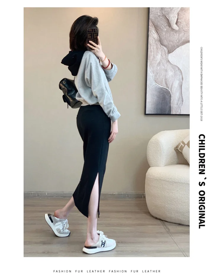 The high-waisted skirt in the set accentuates the waistline, creating a flattering silhouette and enhancing the slimming effect of the sweatshirt.