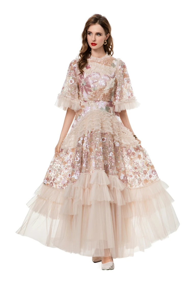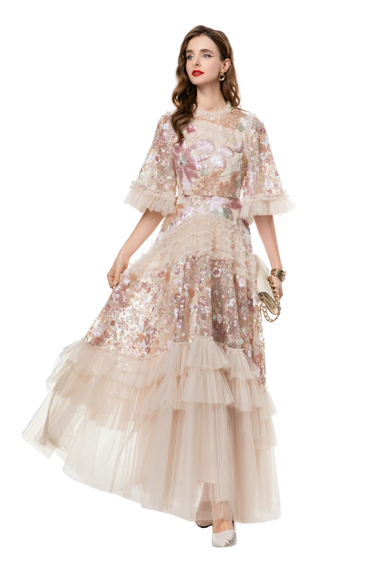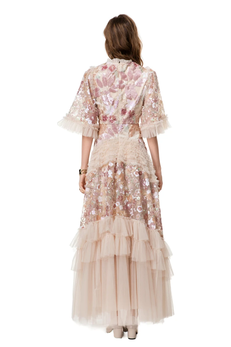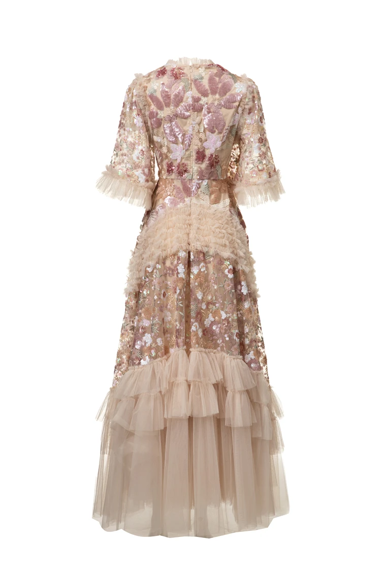 Women's Dress O Neck Short Sleeves Sequined Floral Patchwork Ruffles Elegant Des