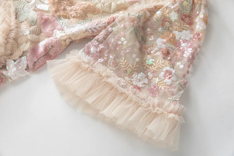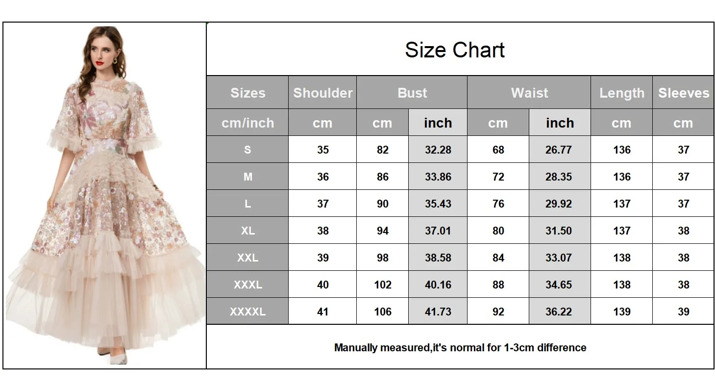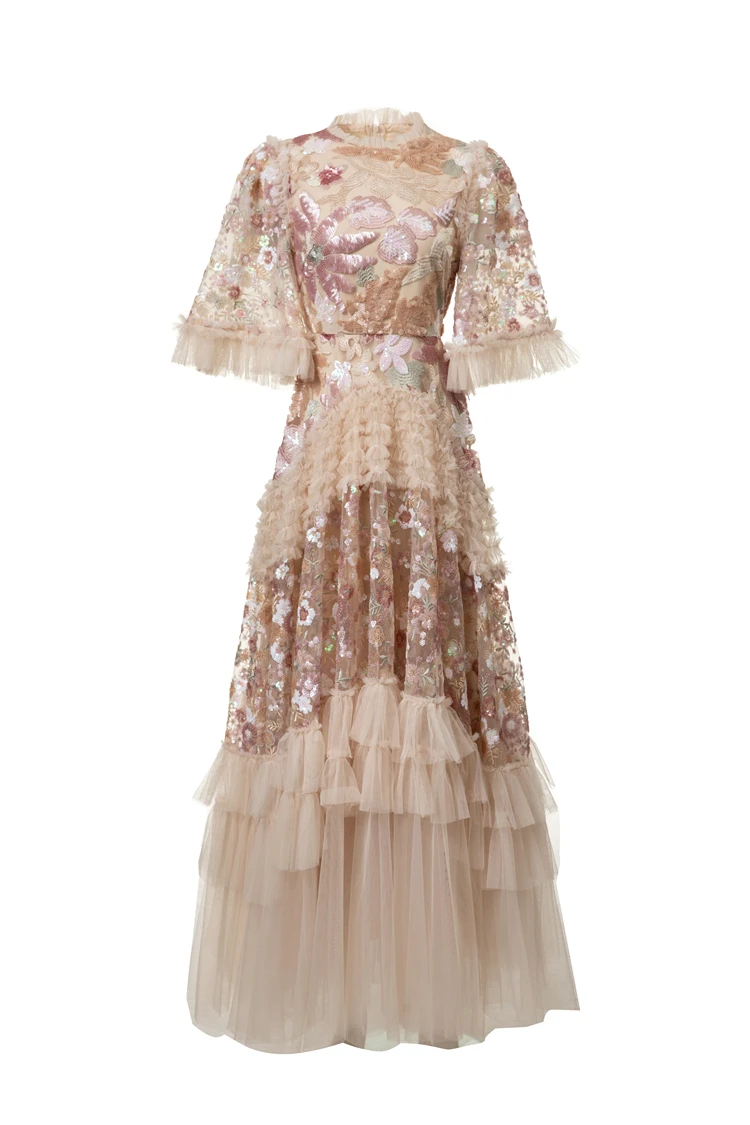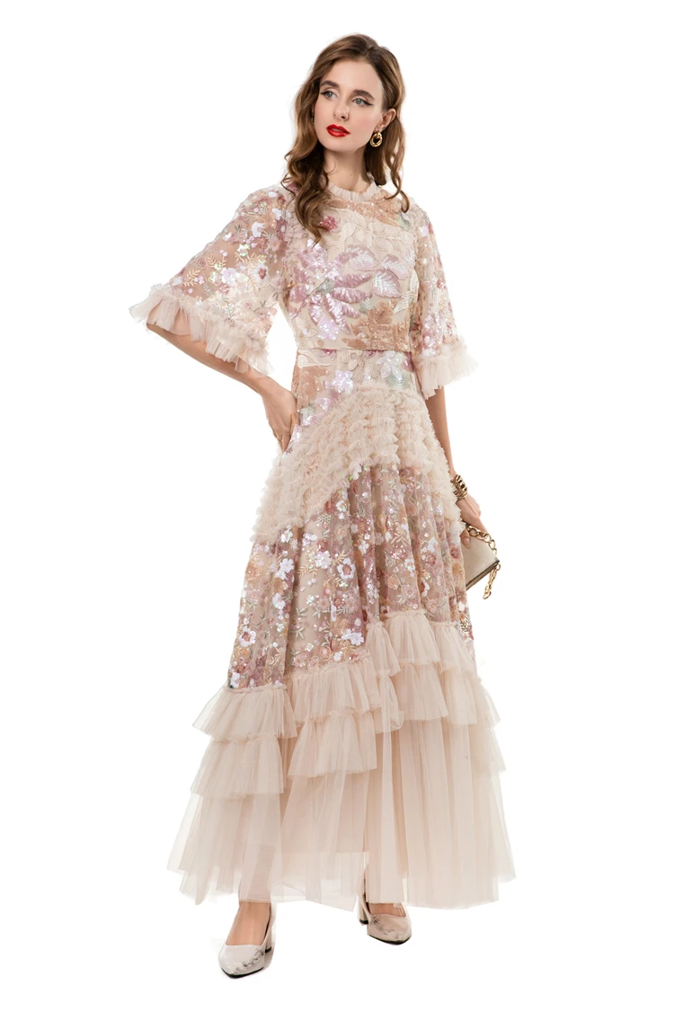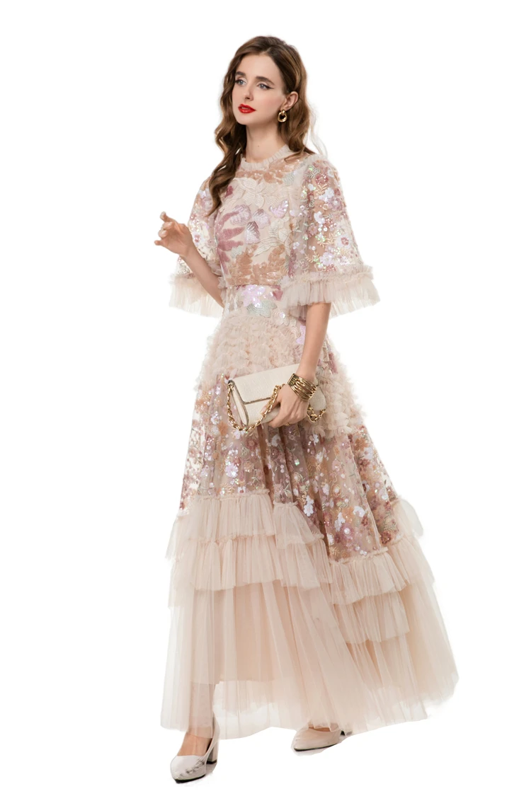 Women's Dress O Neck Short Sleeves Sequined Floral Patchwork Ruffles Elegant Des